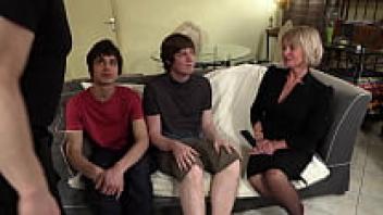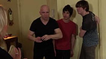 Grandpa watches as a blonde, attractive cougar engages in group sex.