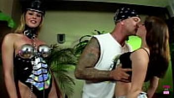 A BDSM blonde bitch gets double penetrated while wearing high heels, latex, and chains.