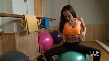 Milana Blanc, a gym devotee, is eager to ride the rubber ball sex toy.