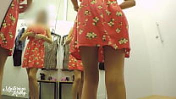 Mysterious Kathy is snooping around the dressing room, trying on outfits, without underwear, and wearing a gorgeous red upskirt.