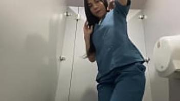 A nurse and a woman are seen on camera in the hospital bathroom.