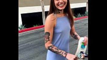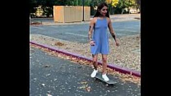 Vanessa Vega, a tattooed skater girl, is seen squirting and skateboarding in public.