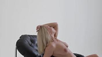 In a BDSM scene, a blonde tied-up Vicky Vette in a choir experiences an orgasm!