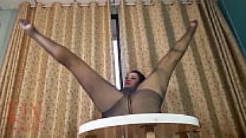 Pretty woman in heels and pantyhose. At the circular table C1, striptease