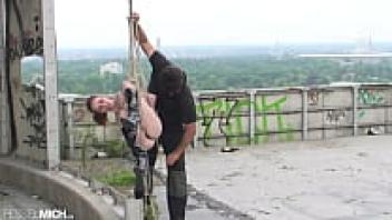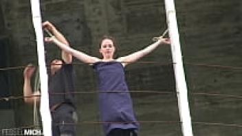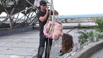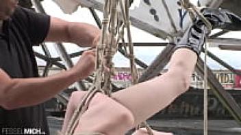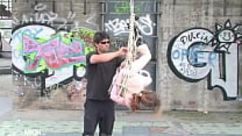 A seductive, nude woman with little breasts is tied up by her rigger in public, hanging on bondage ropes and becoming increasingly vulnerable. Until they are expertly tied up, the ropes continue to bind them.