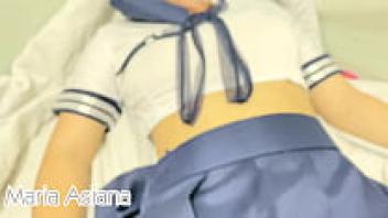 Close-up of a pretty fingering narrow vagina and sucking dildo