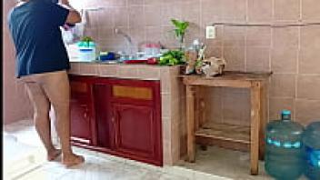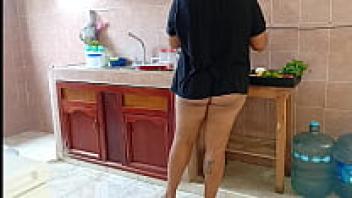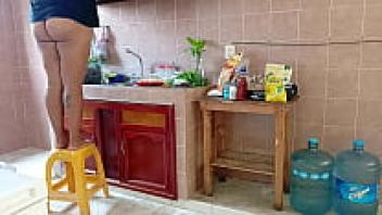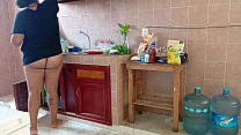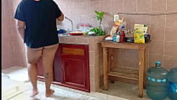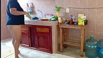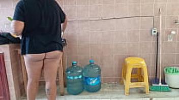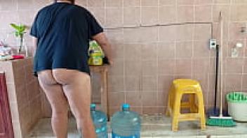 A plump stepmother cleans and scrubs the kitchen.