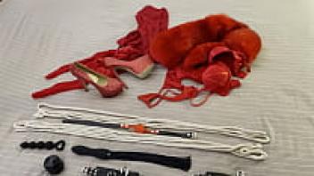 Tied up and adored, a gorgeous redhead milf wearing sensual red underwear! Blindfolded, ballgagged servitude