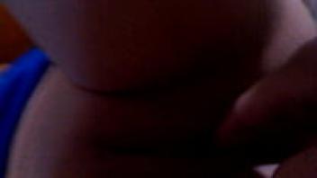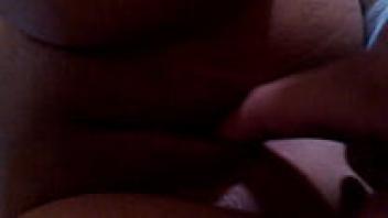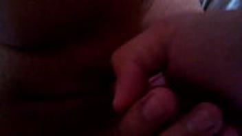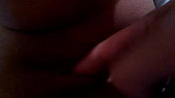 A naked woman with glasses and a hairy bush who is really aroused and stroking her boobs and pussy