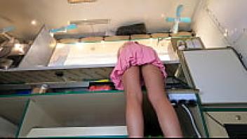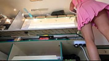 At work, a gorgeous woman wearing a pink skirt and a secret camera upskirt