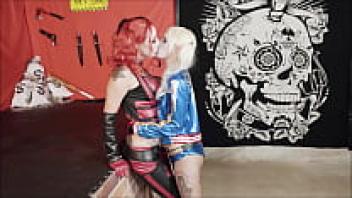 PORNBCN 4K's extreme lesbian sex cosplay kids, Harley Quinn, kissing, and having oral sex with real huge dildos