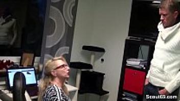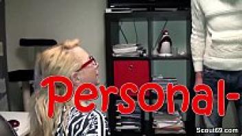 In the first person, a blonde with red lips and spectacles gives a guy with a large dick the ultimate blowjob.