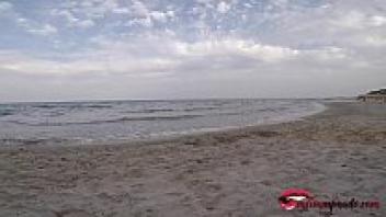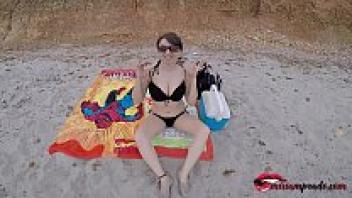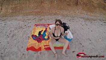 On a public beach, a young girl with large tits performs a handjob. Miriam Prado
