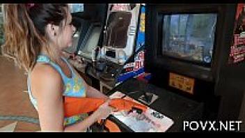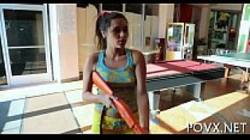 A adolescent of legal age has their butt nailed while getting a massage.