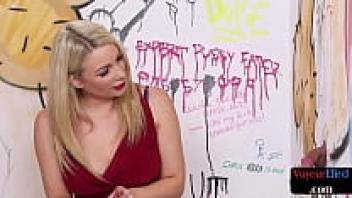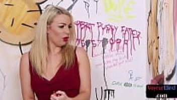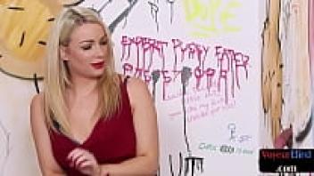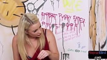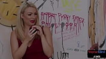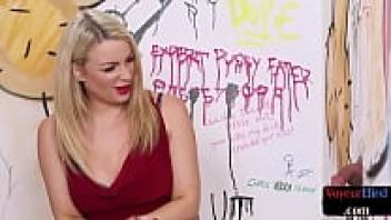A curvaceous British sex worker observes a sub's cock during a kinky session.