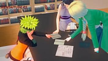 While conversing with Hinata and Tsunade, Naruto falls in love with Sakura beneath the table in Naruto Hentai 3D, an animated pornographic sex manga.