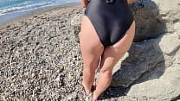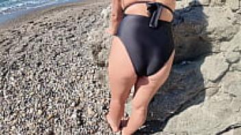 On the beach, Curvy Paws Milf watches some BBC.