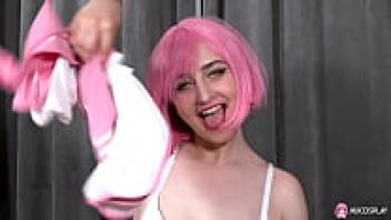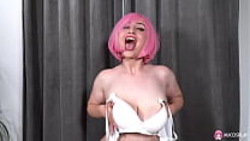 Rada Brewer, a hot pink-haired woman, is toying with a large dildo.