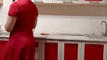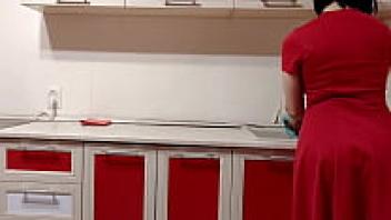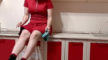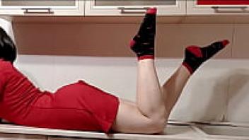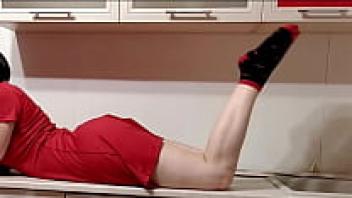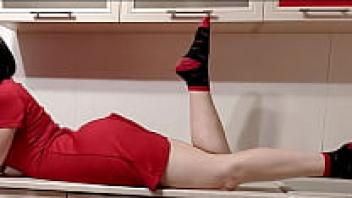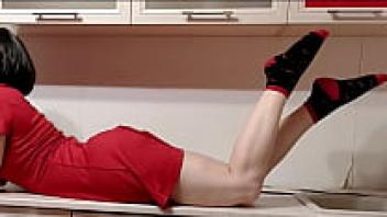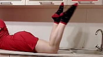 Amazing JOI: A housewife in the kitchen teasing with striped underwear and foul-smelling socks, cleaning filthy, foul-smelling feet in the sink, and wearing a sweet, wet pussy upskirt