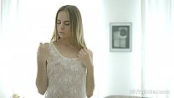 TeenMegaWorld.net: A brunette babe named Jemma enjoys having an orgasm on a bed.