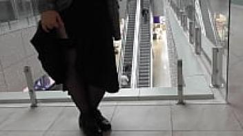 In a café, a hairy, mature display pussy